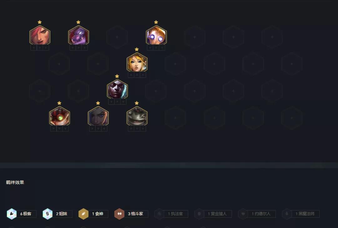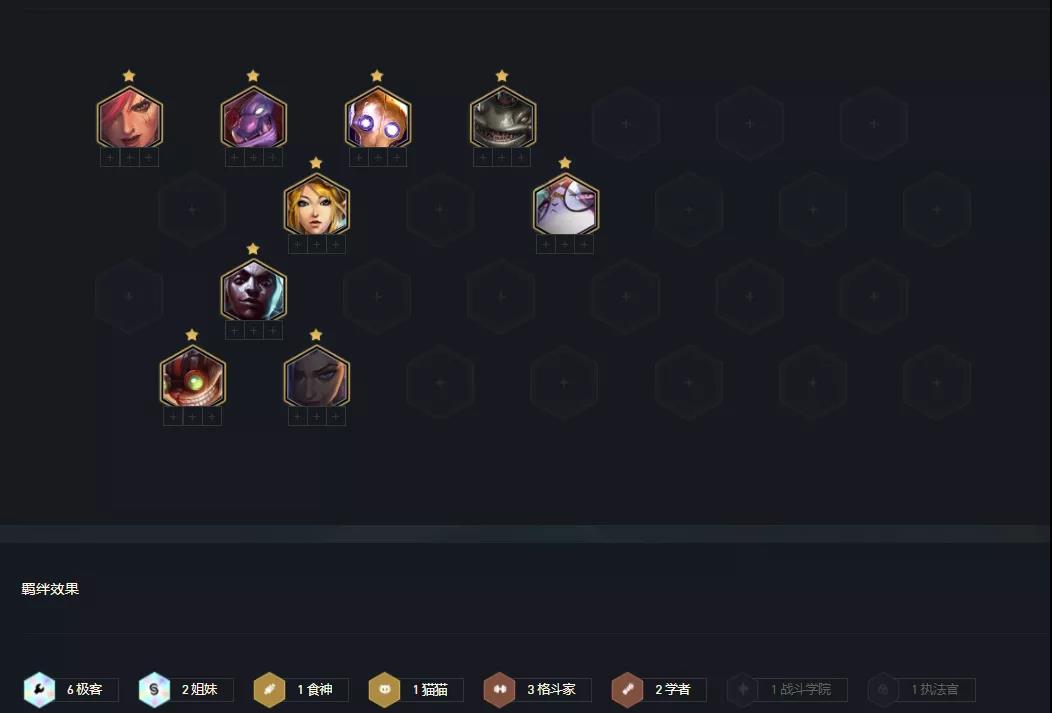 阵容羁绊:6极客 2姐妹 1食神 1猫猫 3格斗家 2学者