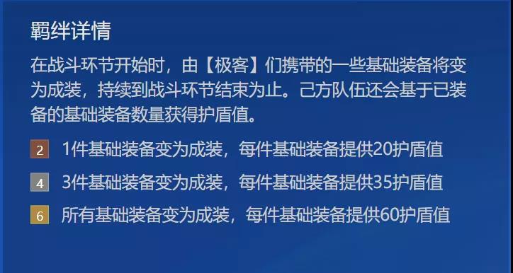 极客羁绊主要是两大作用,一个是开局能获得一个超高的护盾加持,在6极客下每个装备散件都能给每个棋子增加60护盾值,通常对局中会有10-13个成品装备,全员可获得1200-1560的护盾,也可看出全员血量翻倍,阵容的肉度极高。这里特别说明下,极客产生的护盾是场上所有棋子装备的总和,并非只有极客棋子携带的装备才能增加护盾值。