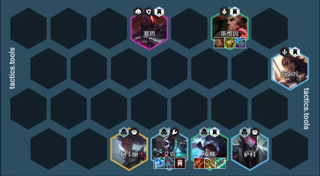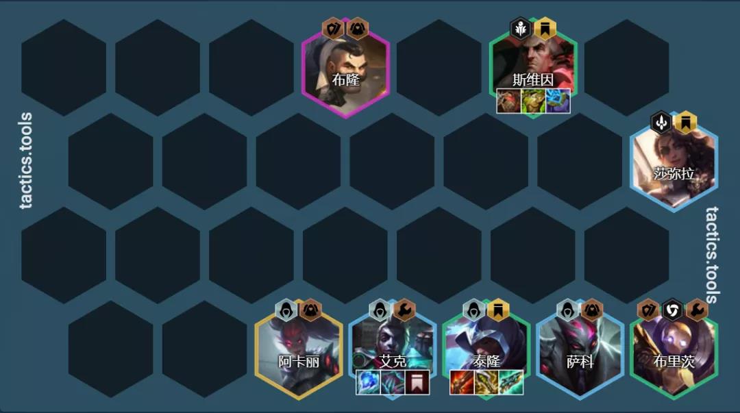 阵容组成:泰隆、斯维因、莎弥拉、小丑、艾克、阿卡丽、机器、布隆