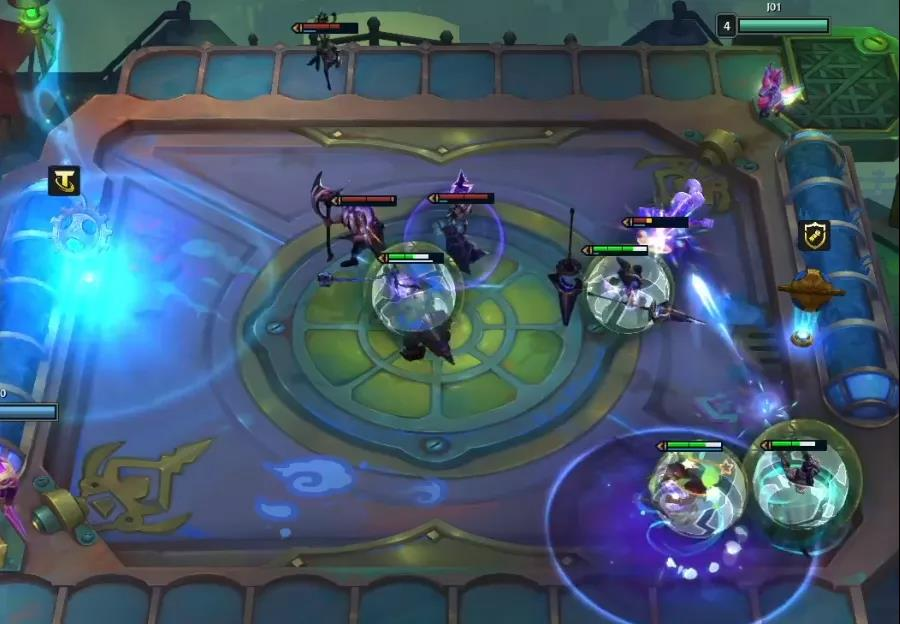 海克斯羁绊已出现成员:牛头,梦魇,猪妹和皇子,每隔几秒就会释放一次冲击波,此外对面那个棋子看起来很像辛德拉。