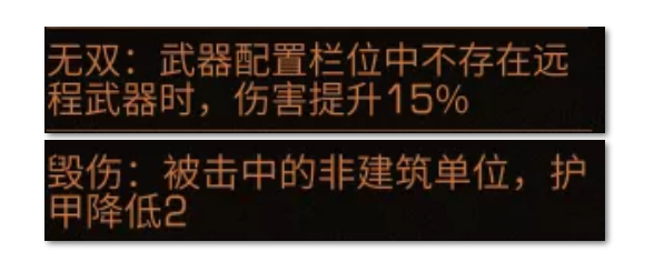 4、其次在副武器方面推荐选择带有无双属性的冷兵器,其他必带属性为满攻和毁伤,推荐使用斩马刀。