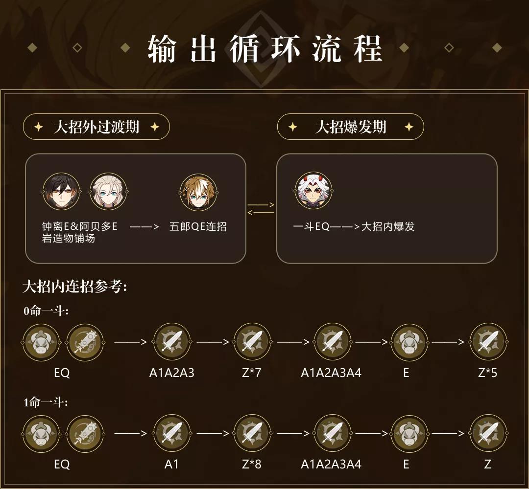 过渡期可以任意穿插钟离/阿贝多/凝光等角色的元素爆发,关键在于打好一斗的元素爆发期。