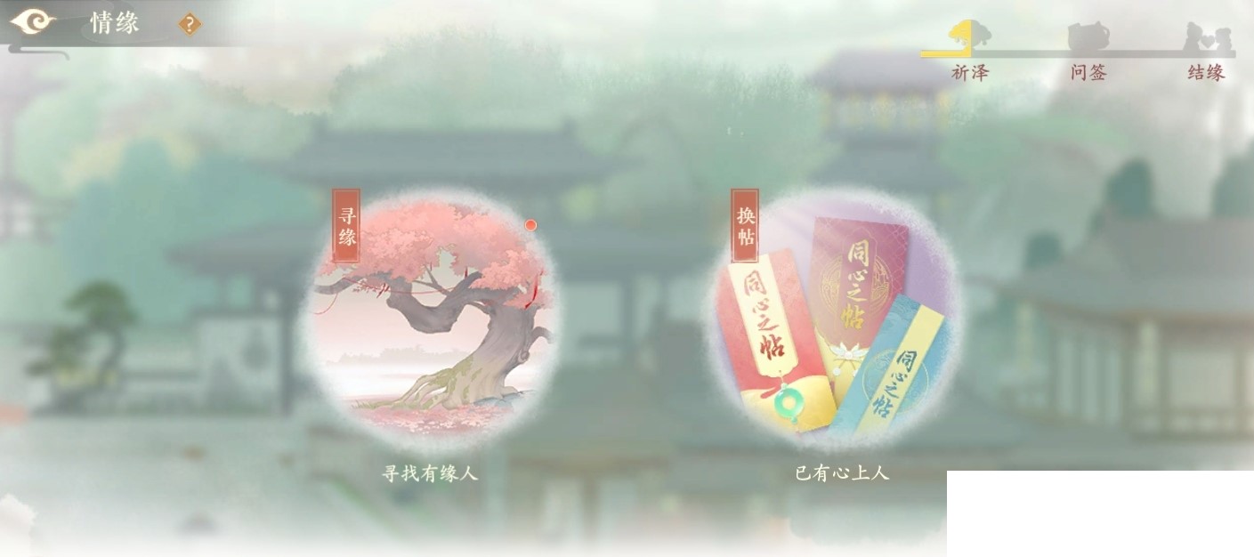 情缘玩法在游戏内就相当于结交伴侣,想要结成一段情缘需要经历三个阶段,分别是祈泽,问签以及结缘。