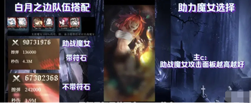 最后就是助战的队友选择,经过up测试助战队友的攻击、防御、血量,是根据助战队友面板直接加成的,而不是裸面板。所以主c的助战队友最好是打另外两个BOSS的主c,这样可以比较方便不需要脱符石给助战队友升攻击力,当然如果符石和材料比较多也可以:选择攻击面板高的其他魔女,拉满级后符石也最好全是加攻击的副属性,并且符石套要是三攻击套。这样搭配队友后:主c一般可以达到10万攻击力的面板。