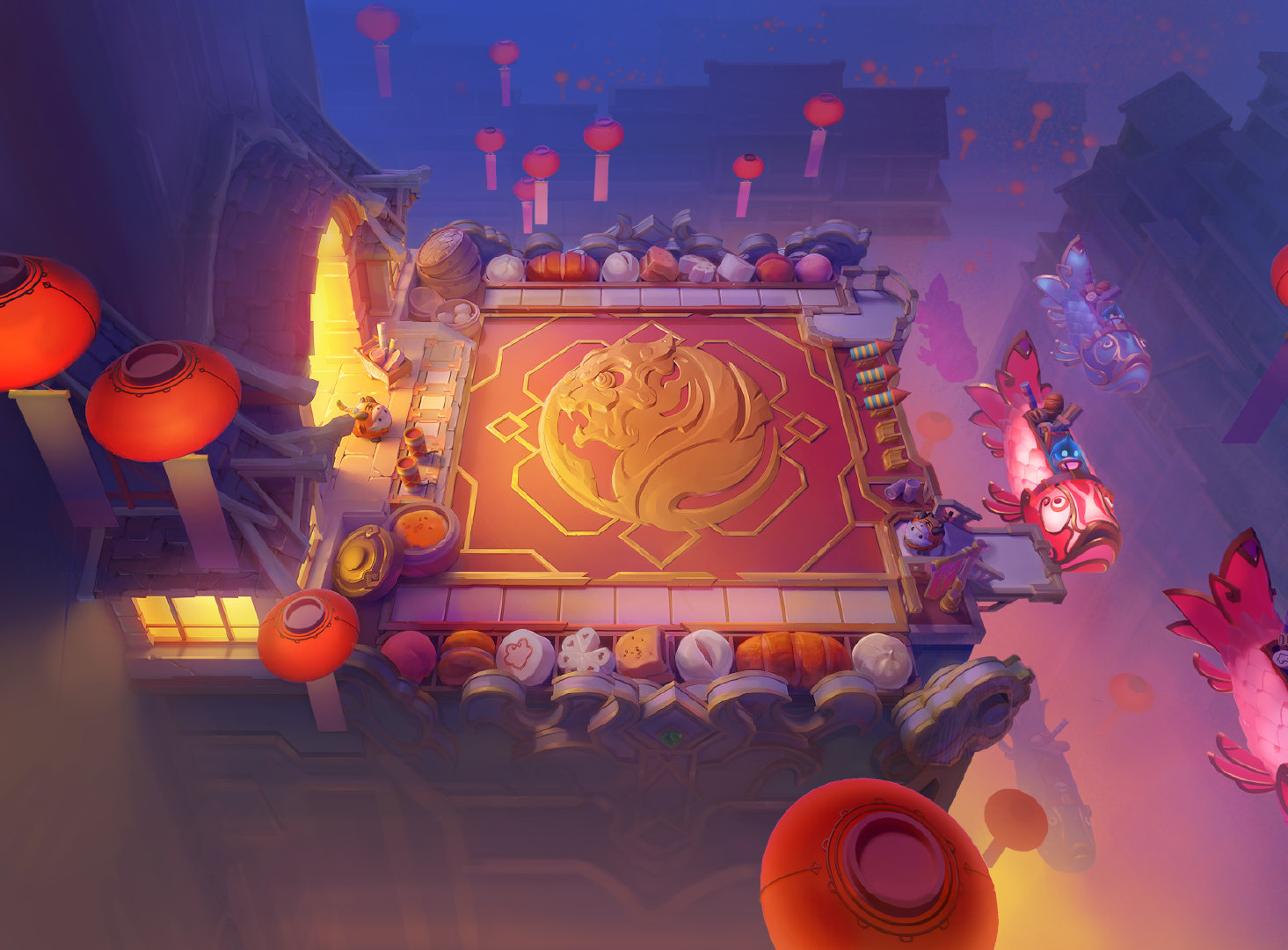 3、战场两边还有两只萌萌的小老虎,以及各种小吃,背景中漂浮着极具节日气氛的红灯笼和由小河灵驾驶的锦鲤船。