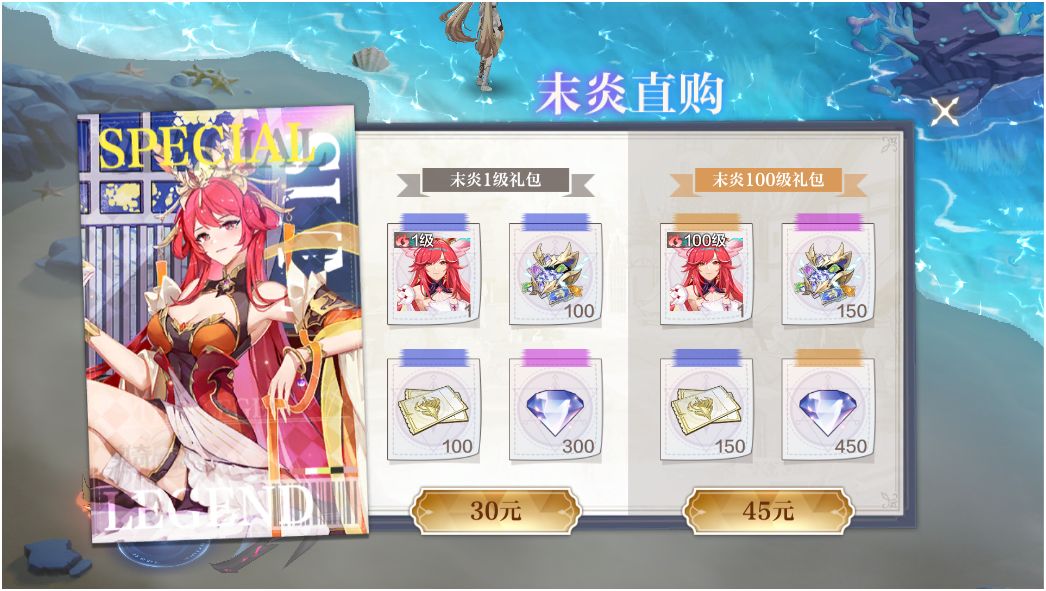 末炎1级礼包:售价30元,礼包内容:女皇·末炎1级*1、扫荡券自选箱*100、主线副本扫荡券*100、钻石*300;
