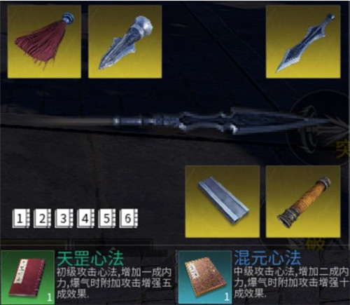 长枪被称为百兵之王,作为强势的长武,有着攻击距离远、攻击力高、自带破甲、控制时间长等优势,所以被认为最强势的武器。侠客可利用长枪的强势,搭配攻击类心法:初级心法天罡心法作为过渡,后期使用中级心法混元心法作为搭配最好不过。初级心法基础可为侠客增加一成内力加成,中级可增加二成内力。暴气后侠客身周气劲为红色,初级可提高侠客五成攻击力,中级心法可提高侠客十成攻击力,搭配上将长枪破甲后的高伤害,可谓将长枪的优势发挥到淋漓尽致!