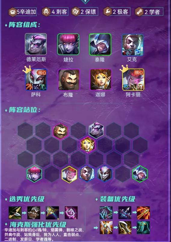 辛迪加刺这次更新的坦度略有下降,但阵容上限非常高,如果能有2星阿卡丽,吃分与吃鸡会非常稳定,且主养小丑在前中期过渡比较稳定,但阵容比较吃5阶段运营与阿卡丽能否2星。