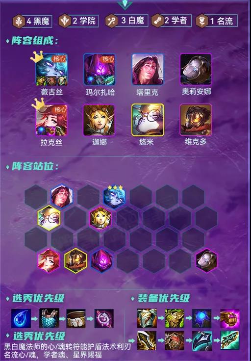 黑白法阵容这周热度大幅度增加,吃分与吃鸡强度均比较高,黑白魔变阵较多,主要就是4黑打底看自身海克斯与针对敌方选择搭配4到8黑魔或2到4白魔或学者羁绊。