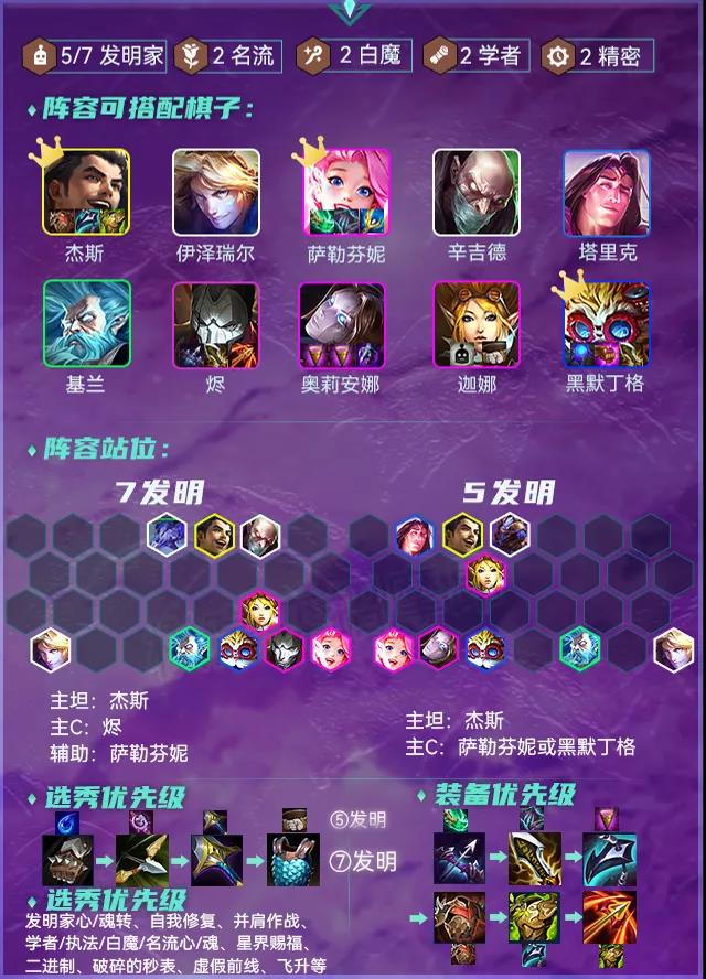 海克斯方面如果有发明家心/魂转一定要拿,7发明家召唤的龙输出、坦度、控制能力均为一流。自我修复、二进制对阵容提升也非常高;自我修复、并肩作战、学者/执法/白魔/名流心/魂、星界赐福、破碎的秒表(烬主C)、虚假前线、飞升等都可考虑。