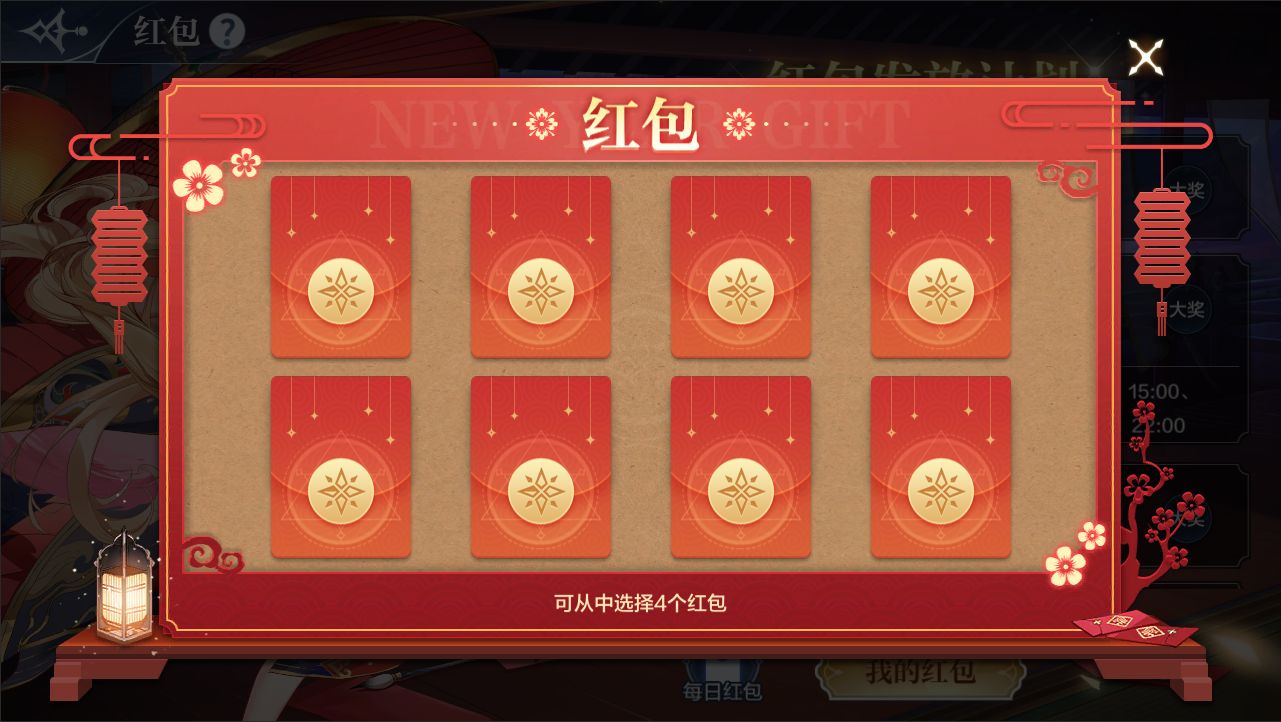 活动内容: 春节期间,每天将于指定时刻向全服玩家发放新春红包,新春红包还能开出稀有的欧皇大奖哦!