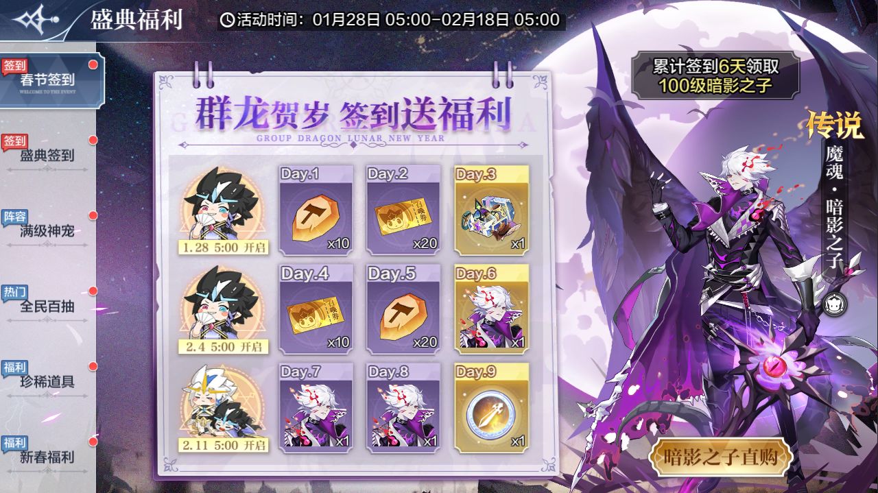 二、【春节福利】全民签到领100级魔魂·暗影之子,梦之队神器自选