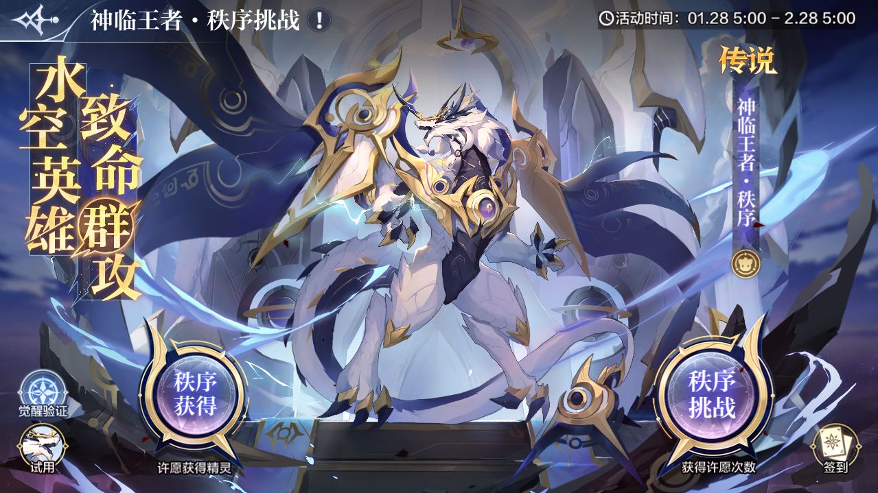 通过神临王者·秩序中的签到及挑战,可获得秩序许愿券,使用秩序许愿券可以进行召唤,通过挑战及签到,必定可召唤获得神临王者·秩序。2月4日0点前获得神临王者·秩序,可额外领取神临王者·秩序头像及神临王者头像框。