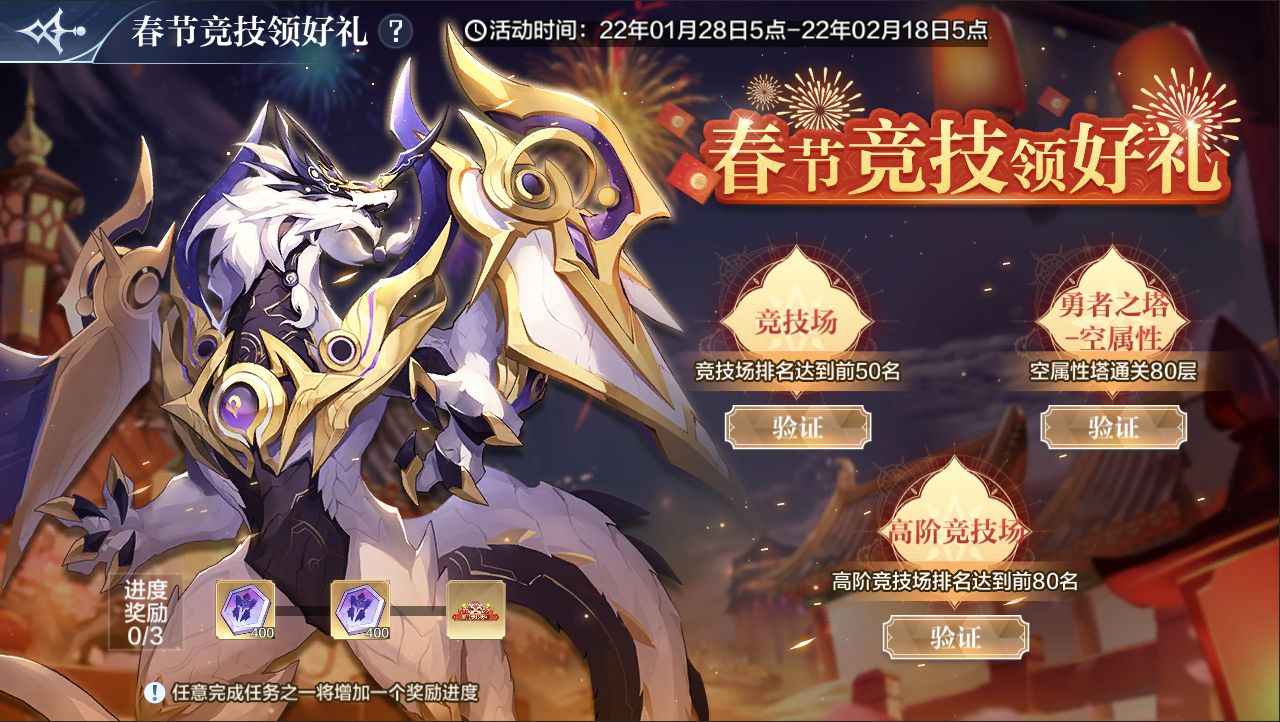 完成指定竞技任务:竞技场达到指定排名、高阶竞技场达到指定排名、空属性塔通关指定层数,即可领取800神器币&限定称号-2022春节竞技大神!
