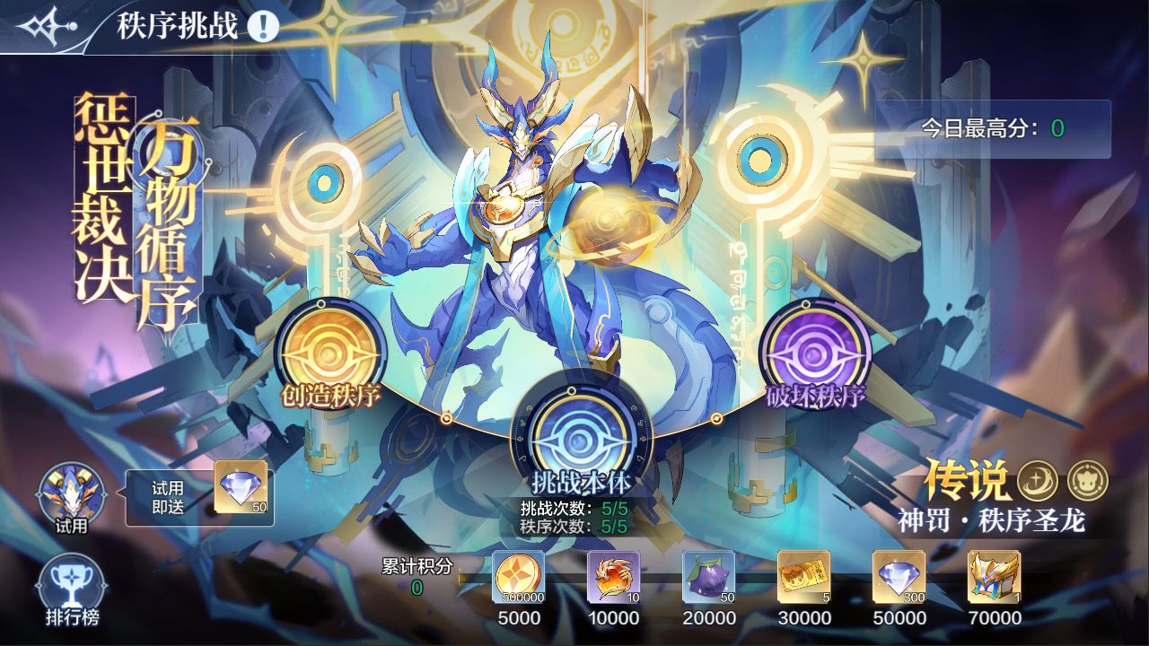 每日挑战秩序圣龙,根据伤害转化为积分进行排名,未获得过秩序圣龙得玩家,当日单次最高积分排名在全服前50名,次日进入挑战界面,可获得1只1级的神罚·秩序圣龙