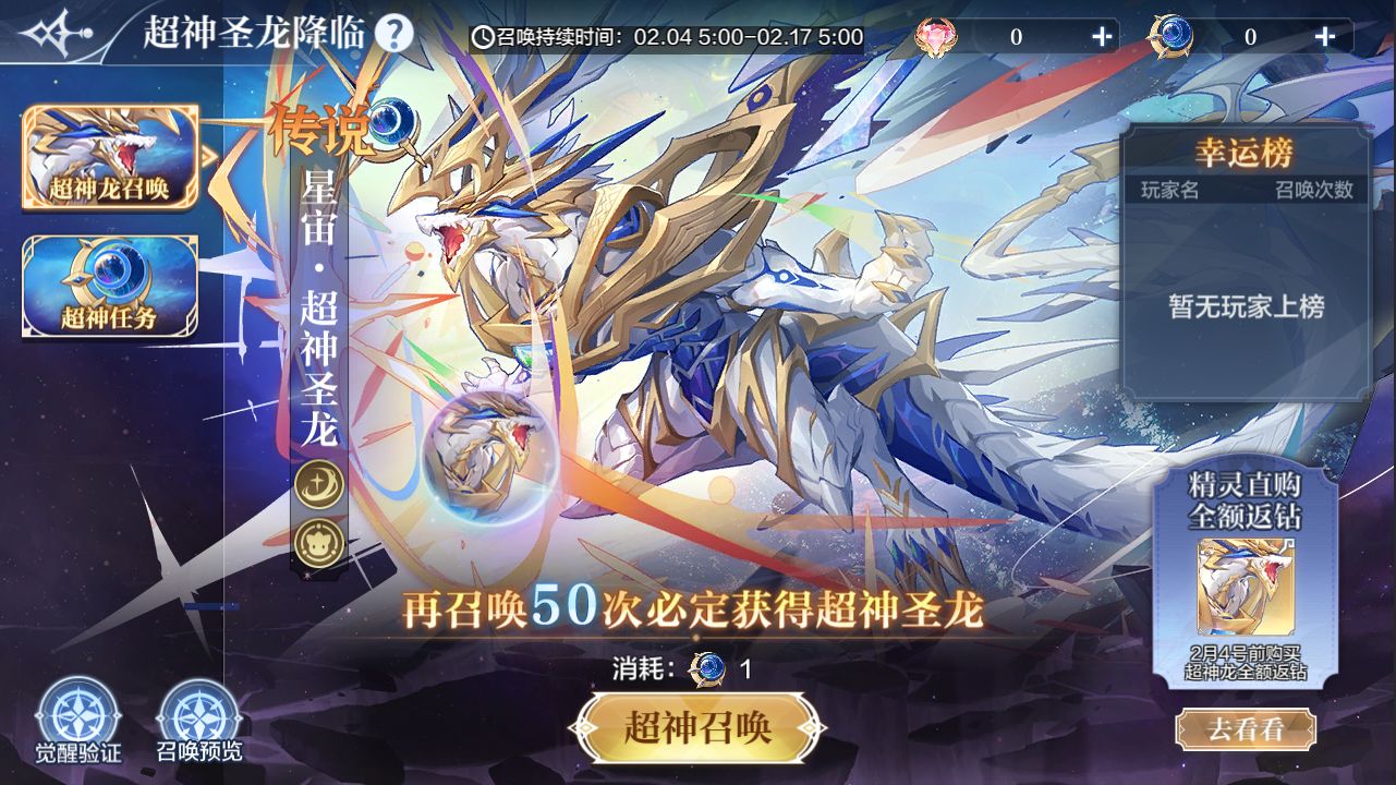 2月4日凌晨5:00-2月18日凌晨5:00,可使用超神之星召唤星宙·超神圣龙