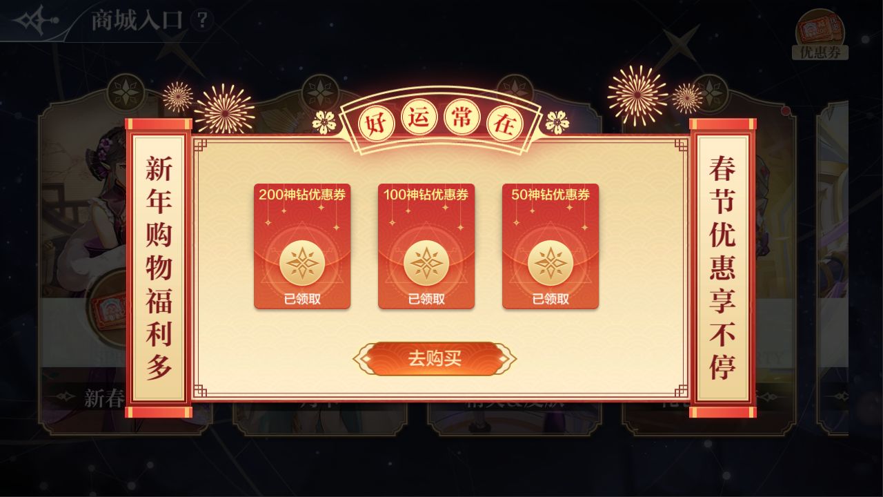 新年购物福利多,春节优惠享不停。奥奇新春商城火爆开放!200/100/50神钻抵扣券直接领,火爆商品春节最多直降200神钻,传说神宠/精美皮肤/珍稀道具超划算!