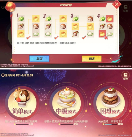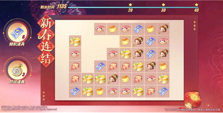 新春连结活动共分为简单、中级、困难三种模式,每个模式内关卡不同,每个关卡内,用三根以内的直线将相同食物连结在一起即可消除,消除全部食物即可完成关卡。在关卡内遇到困难时可使用道具助力,消除关卡内的道具也可以触发道具效果。根据完成关卡消耗的时间不同将获得不同的星级评分。