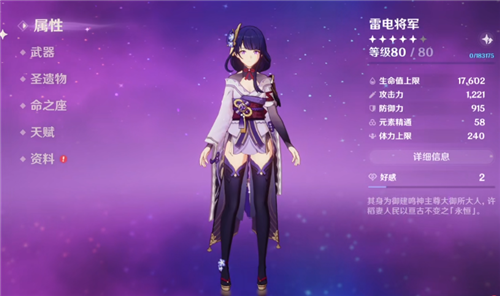 最终充能效果提升32%,雷电将军非常依赖充能效率,因为大招需要高达90能量,所以说充能效率对于雷电将军来说是非常关键的,所以雷神的突破就是增加充能效率。
