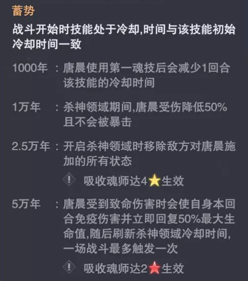 唐晨回合开始时会消耗唐晨所有的魂力来永久提升他的伤害,最高可以叠加20层提升150%的伤害