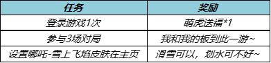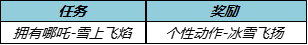 庆祝春节冰雪周开启,活动期间登陆游戏并完成相关任务即可领取哪吒-雪上飞焰主题语音等奖励。