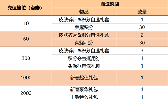 新春豪华礼包:打开礼包可任意选择以下奖励之一:铭文碎片*600、战令币*80、战令经验*4000、紫星币*5