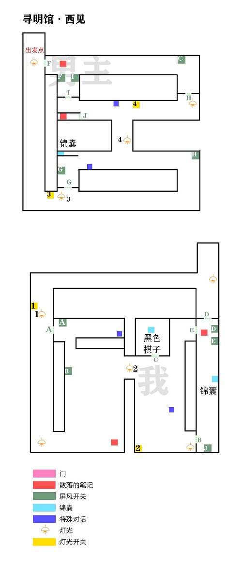 1、寻明馆分为男主和玩家两个视角,玩家需要控制两个角色找到地图中的锦囊和解开各个机关才可以进入下一章关卡。