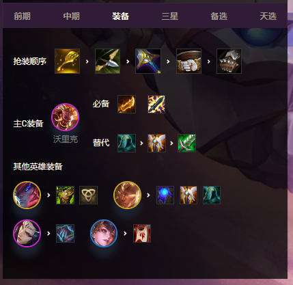 前期有孙悟空或者武器的就直接用,如果没有天使天选就用其他天选过度,等6人口或者7人口寻找艾瑞莉娅和沃里克的天使天选。