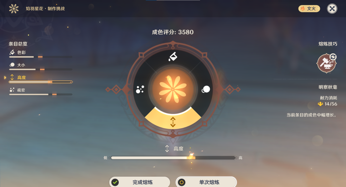 2.在大小条目,使用一次【中火】大刀阔斧,然后在高度条目使用一次【中火】明察秋毫。
