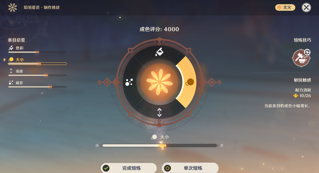 3.在色彩、大小、疏密条目各使用一次【文火】敏锐触感即可完成。