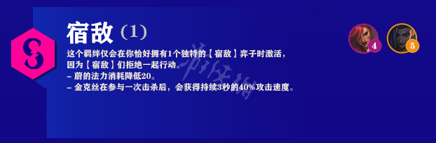 宿敌羁绊类似于s5的神王羁绊,两个宿敌中只有存在一个才可以触发。