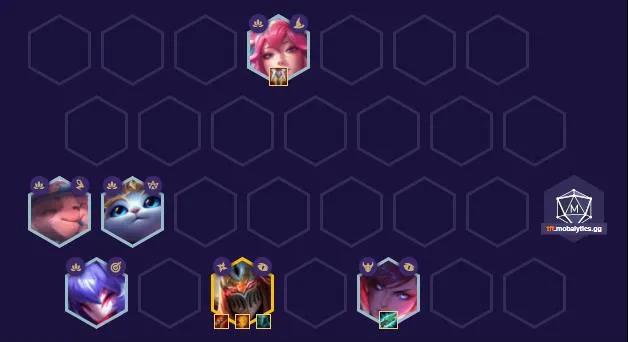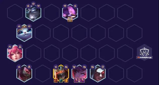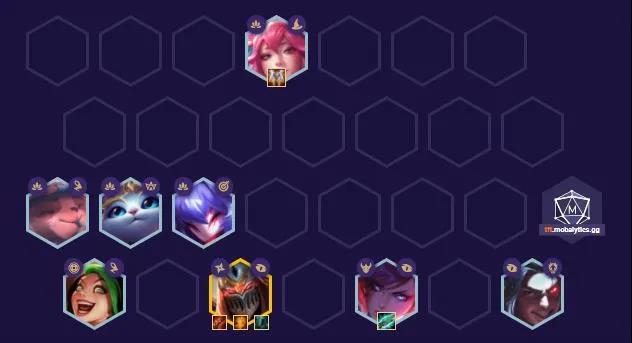 根据对局变阵下四明昼上四忍者变阵,舍弃明昼攻速,换忍者加成伤害,输出更加爆炸,而且有慎和凯南双前排,复活甲上给凯南增加控制,如果牌顺装备好,可以放弃双明昼,劫上火炮羊刀水银,四忍四夜影,补时光、派克三猩红,上限最高。