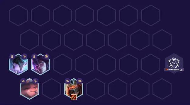 如果开局小兵出攻速有火炮就可以选择猩红起手,低人口时多一只加里奥压制力很充足,等寡妇来也好凑夜影羁绊。