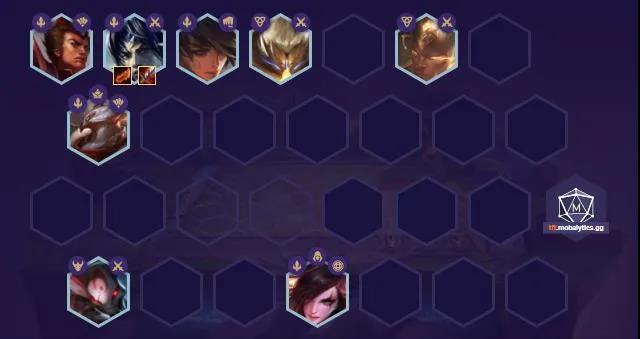 阵容核心输出赵信,由于是近战英雄,第一件装备优先出续航装饮血剑,赵信纯物理输出,饮血剑除了物理伤害恢复还有灰盾能保一手赵信,虽然有决斗羁绊叠加攻速,第二件装备最好还是选择羊刀,攻速叠满达到上限,输出爆炸还能快速释放技能叠加双抗。