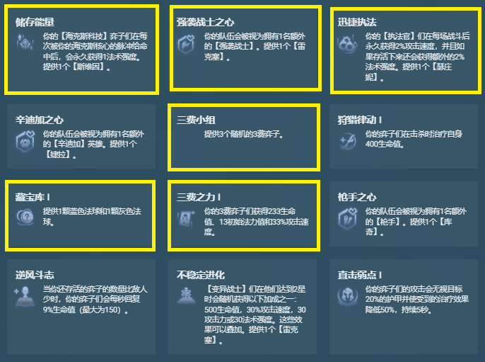 在战斗环节开始时和之后的每6秒,[海克斯核心]就会发射一道脉冲来为友方[海克斯科技]弈子们提供一层持续4秒的护盾。在护盾处于激活状态时,攻击会附带额外魔法伤害。这个护盾不会叠加。