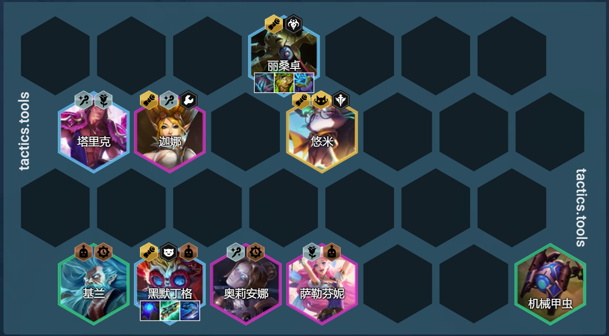 丽桑卓一个人站在前排,猫咪在旁边提供护盾保护。风女和宝石站在第二排防止对面坦克切后。后排将基兰放在最边边防止机器钩子,因为黑默丁格的攻击距离如今+1,所以大头是可以在最后一排就能够打到前排的敌人,是不需要放在倒数第二排的。
