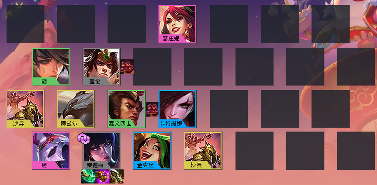 蔚和盖伦站第二排充当坦克他们又肉又有输出,瑟庄妮站最前提供AOE控制。