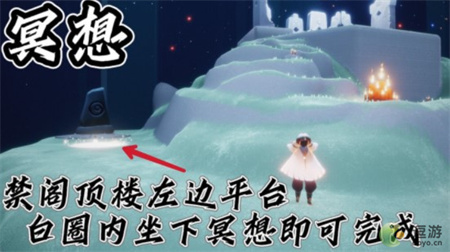 最后一个冥想任务在“禁阁的顶楼”,从第一层坐电梯上去之后,在左侧平台可以看见冥想点。(上图所示)