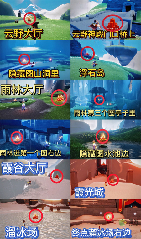 分别在云野、雨林、霞谷,每一张图都有四堆,具体位置下图所示:
