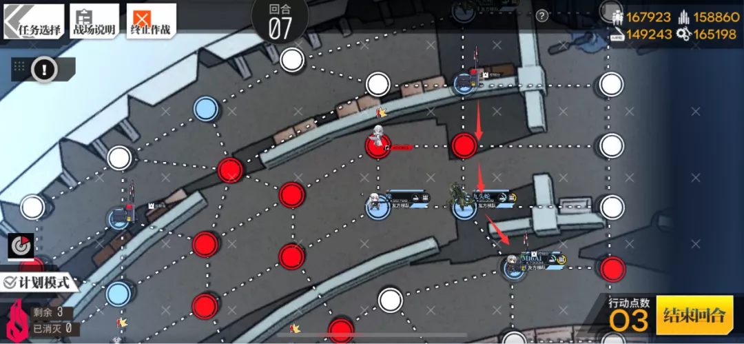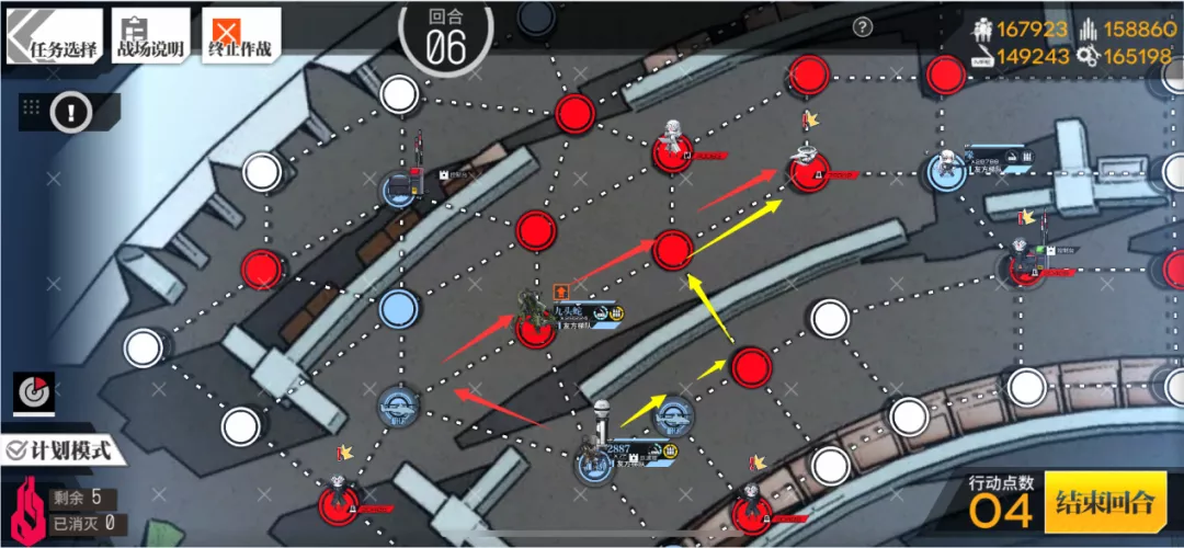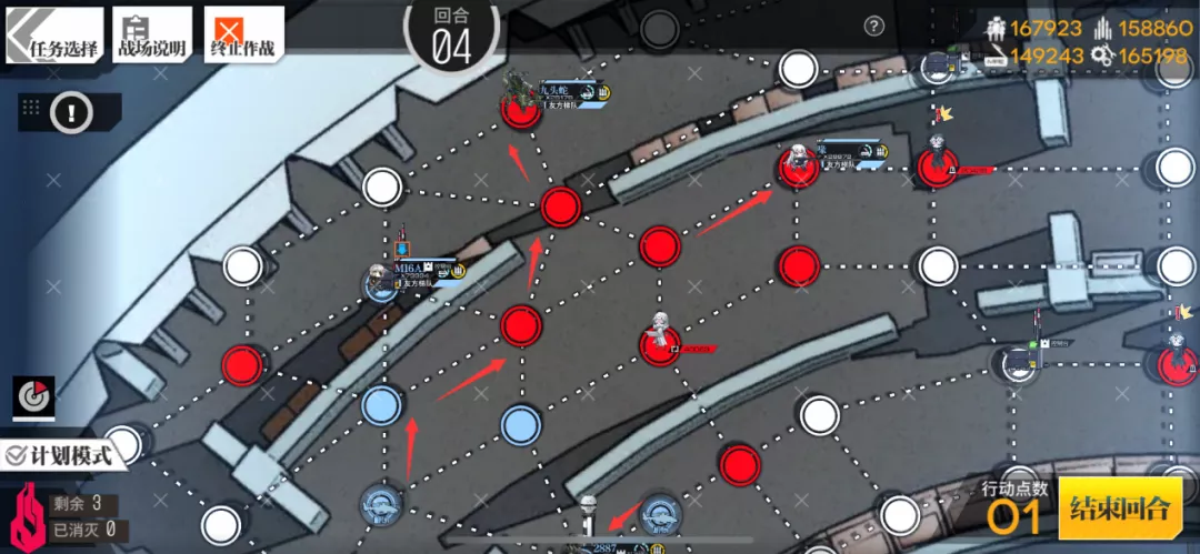 第四回合,刷出来2887后,让2887向下走给九头蛇套上迁跃buff,一路向上走消灭敌人,喙向右走一步继续牵制敌人