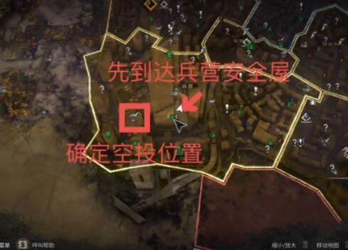 首先确定位置是在一个有空投的楼顶,然后到达兵营坐电梯上楼顶飞过去。
