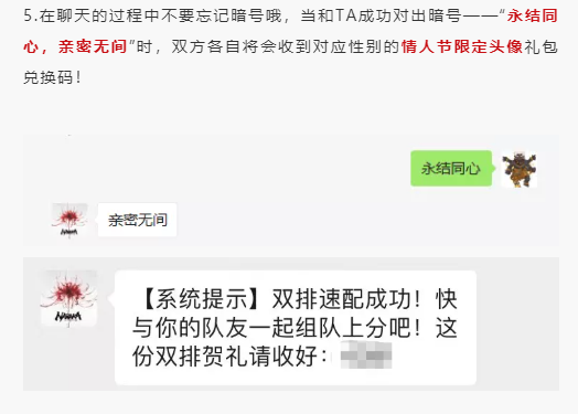 本次更新后,天选之人双排模式将同步开启!为了让大家能更方便地找到双排队友,2月14日12:00-2月22日24:00期间,《永劫无间》官方微信公众号限时开启聚窟洲双排速配活动,成功匹配且喊对口号的两个人更可以获得情人节头像兑换码。