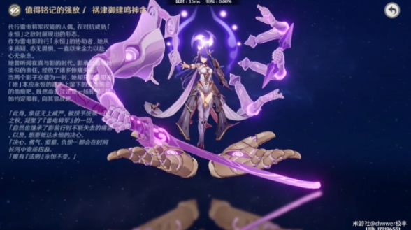 周本boss的技能分为强化前(雷电将军形态)与强化后(图鉴形态),强化周本boss的怒气值会小幅度增长,受到攻击后会有一定增长,怒气值满后会出现雷元素铠甲(强化后形态),此时周本boss每一刀都会扣除角色的元素能量且扣除周本boss自身护甲值,护甲值为0时boss会进入虚弱状态,为最佳输出时机