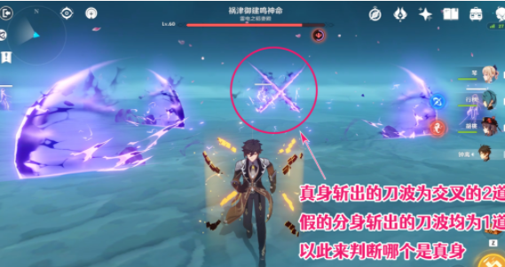 1、4个分身中,假的分身斩击出来的刀波是1道,而真身的斩击出来的刀波是交叉的2道,