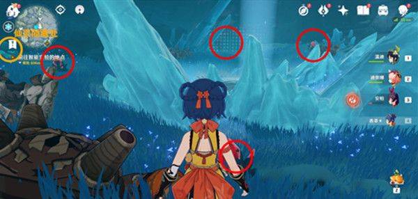 仙灵位置:一个在坚冰高处,较为明显,另一个隐藏在图中的雪堆处,用火元素攻击融化雪堆即可使仙灵归位。