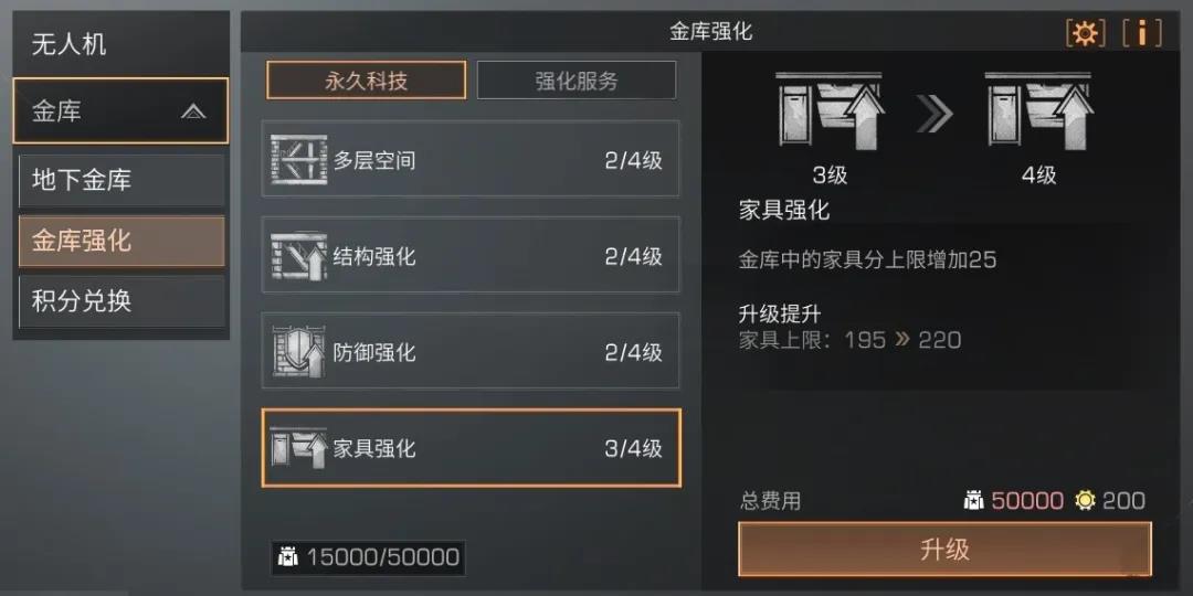 建议将家具强化提升到三级,金库可容纳的柜子数量可以直接提升至195个,就连爱囤积的幸存者看见了也会直呼过瘾吧!