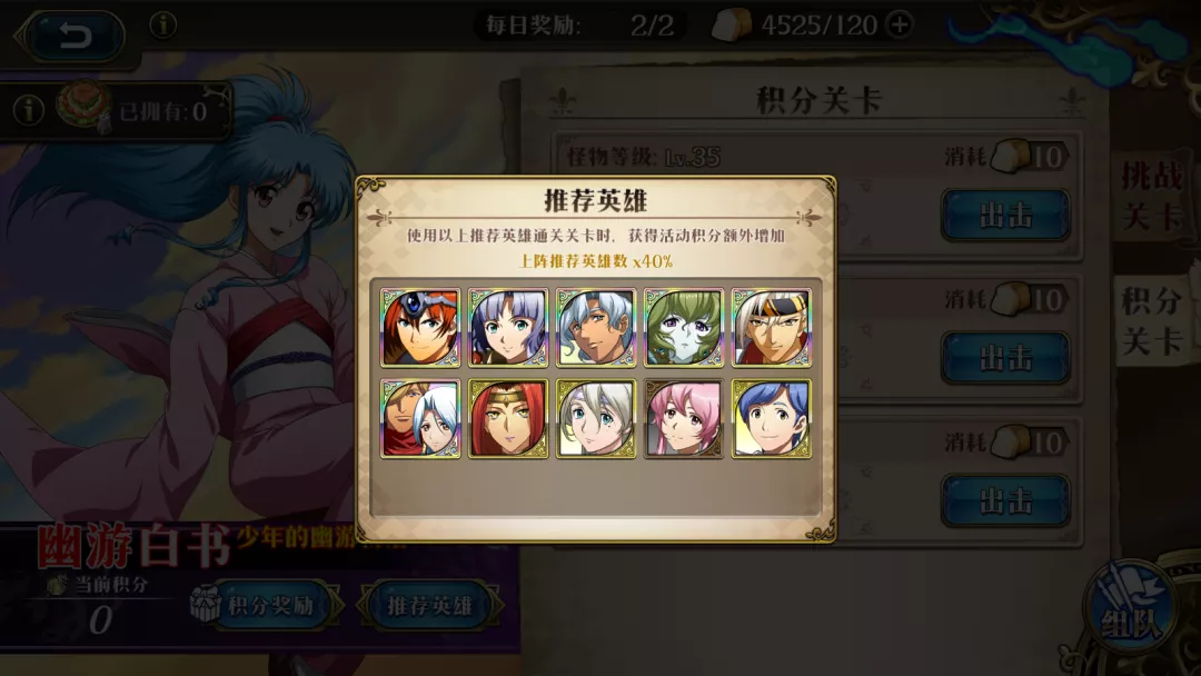 使用以上推荐英雄通关关卡时,获得活动积分额外增加上阵推荐英雄数×40%。