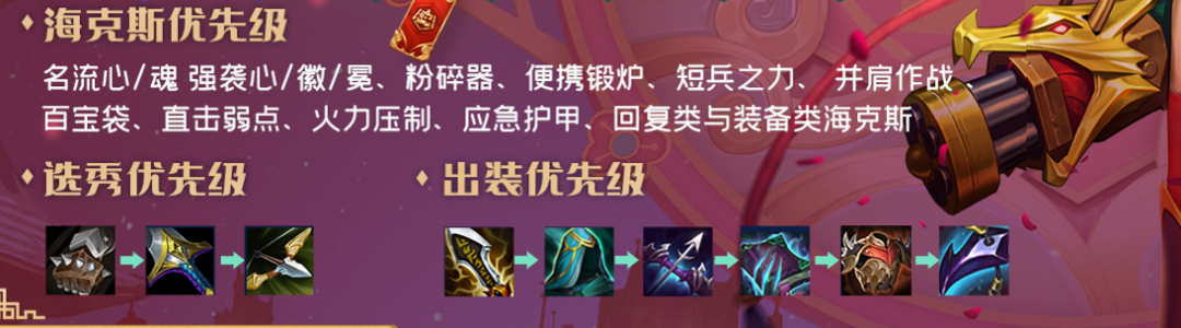 开局选秀:拿取的装备最优就是拳套或宝剑,主要可合成刀妹关键装备无尽、巨杀和水银。如果第一个海克斯有名流心/魂、强袭心/徽/冕最优。