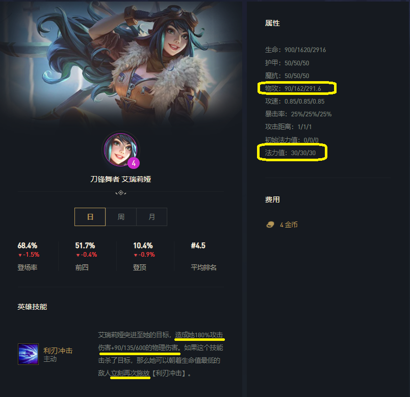 艾瑞莉娅纯物攻输出棋子,技能可暴击。比较建议出装:无尽+语/巨杀+水银。