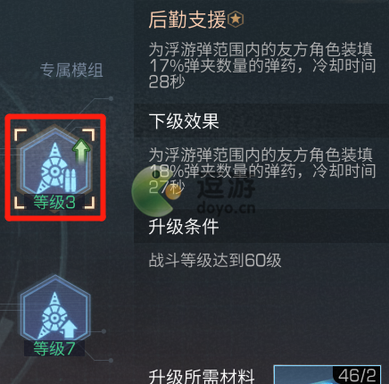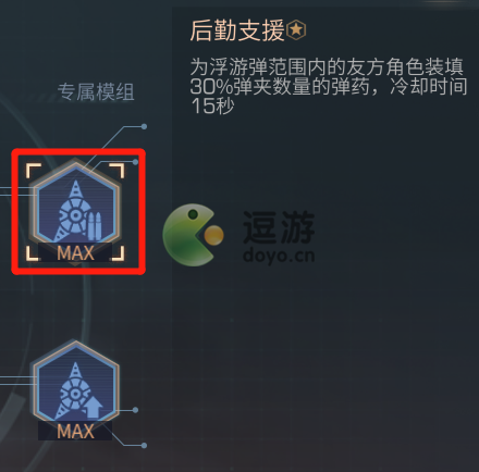 ①后勤支援:可为浮游弹范围内的友方角色装填一定比例弹夹数量的弹药,极大地提高了幸存者作战的续航能力,升级至满级后可以装填30%弹夹数量的弹药,冷却时间15秒